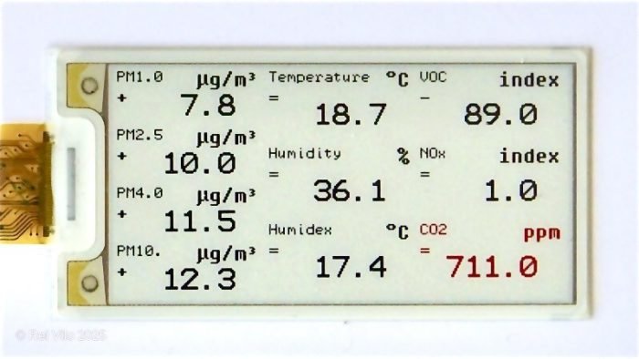 This high-resolution EPD features black, white, red and yellow colours with Eink Spectra 4 technology from Pervasive Displays Inc. providing the perfect indicators to show users air quality levels in different colours. Thanks to its ultra-low power consumption and excellent paper-like contrast ratio, we can show a lot of information on the screen such as PM, VOC, CO2, temperature, humidity and more instant results.