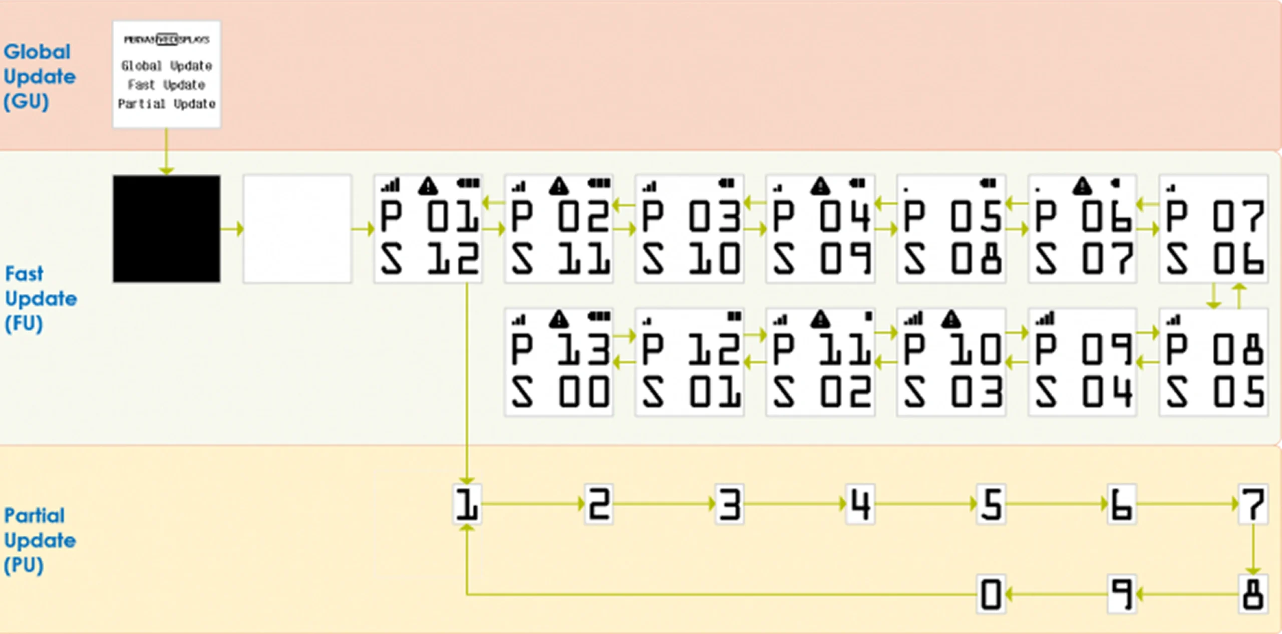 Pervasive Displays supports both Normal Update (also referred to as global update or global refresh) and Fast Update (also referred to as local update or fast refresh). A normal update affects every pixel on the display, whereas a fast update only affects the pixels that need to change in order to display the new image. With a fast update, the full image is sent to the driver IC, which compares the image data. A partial update requires an area (window) to be defined, after which the system sends only the image data specific to that area, using the same driving waveform to carry out the update.
